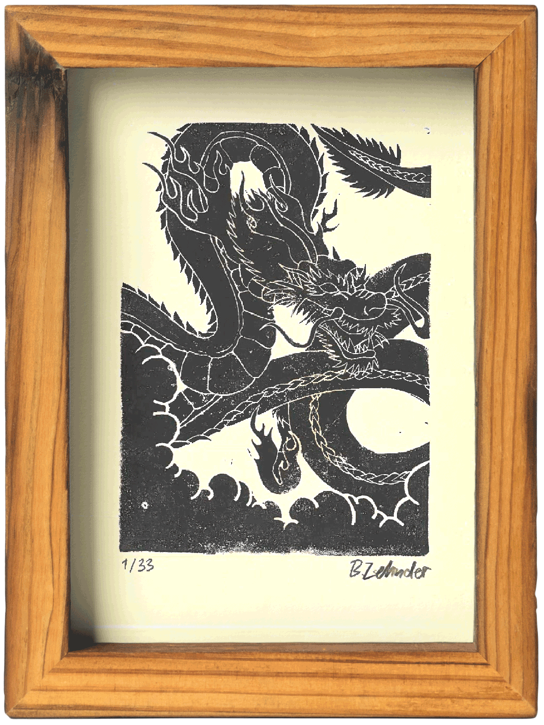 FOR YEARS I HAVE BEEN FASCINATED BY JAPANESE AESTHETICS AND ART. WHILE DELVING INTO THE ART OF UKYIO-E (WOODBLOCK PRINTING), THE IMPULSE CAME TO CREATE A WORK THAT IS A COMBINATION OF THIS ART AND MY STYLE. AN EDITION OF 33 HAND-PRINTED LINOLEUM PRINTS OF WAS CREATED.